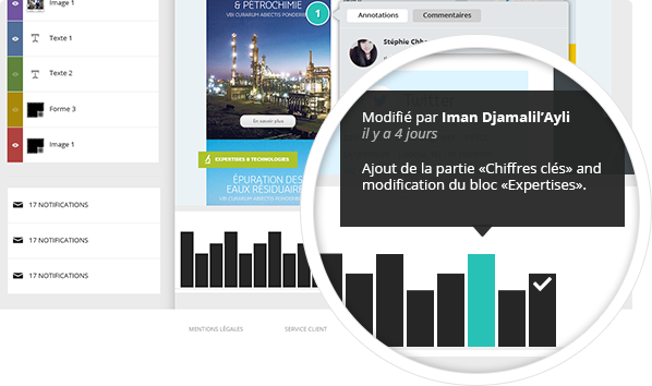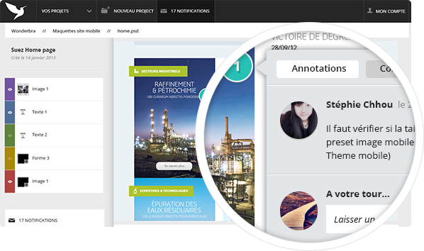 Terminé les longs mails et les captures d’écran ! Vos clients et collaborateurs peuvent commenter directement les fichiers sur Huloa. Gagnez aussi du temps et en précision grâce au système d’annotation.